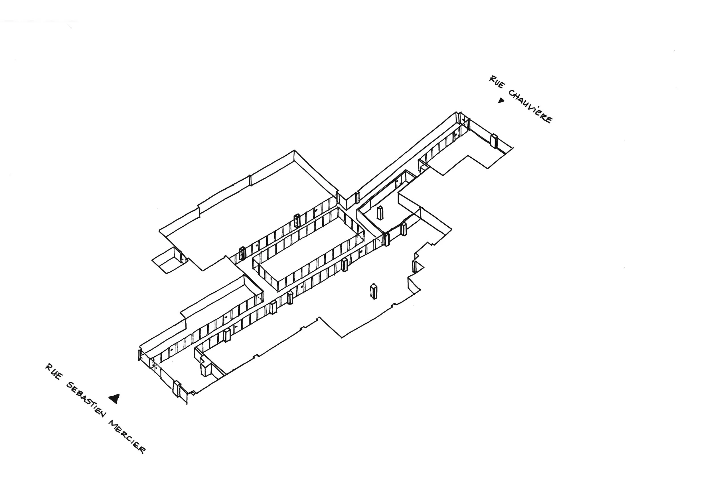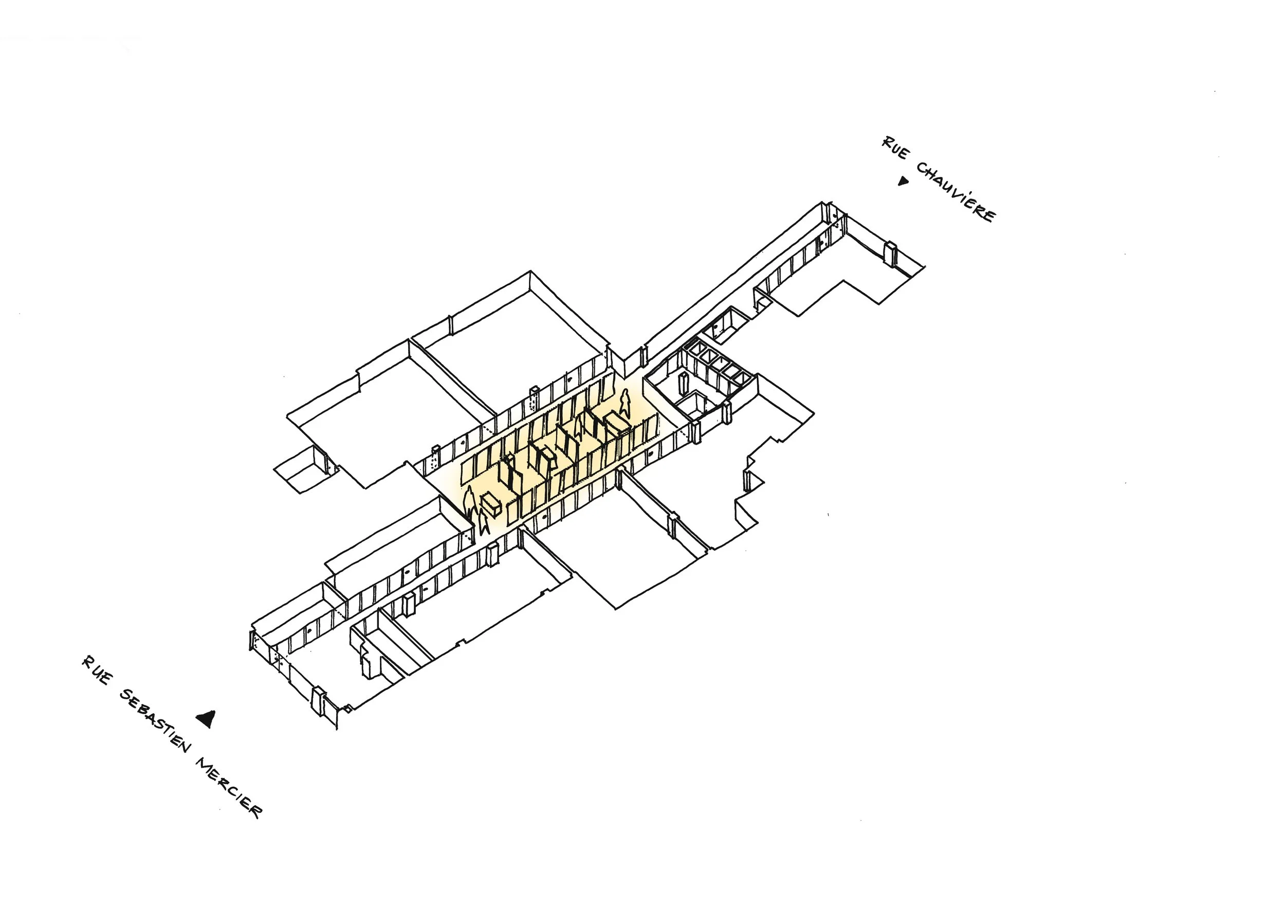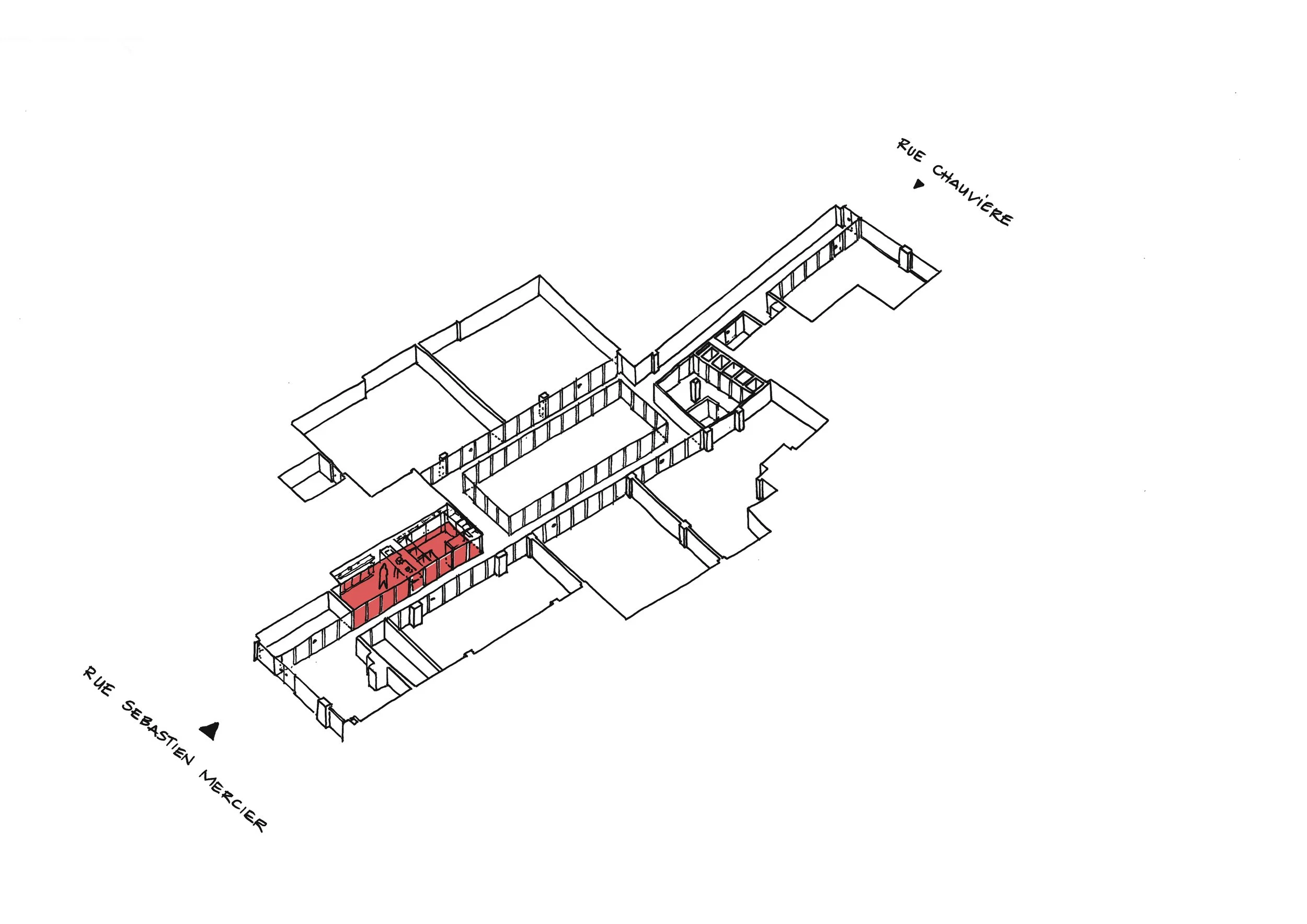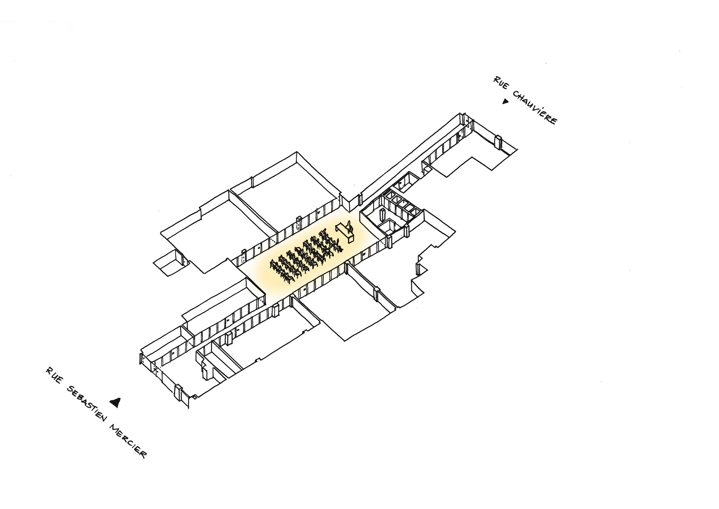 Mesnil Architectures est missionnée pour transformer un local traversant de 500 m² en rez-de-chaussée, situé entre la rue Sébastien-Mercier et la rue Emmanuel-Chauvière, en un lieu contemporain capable d’accueillir les ateliers, les salles de cours, l’administration et les espaces de vie de l’école.