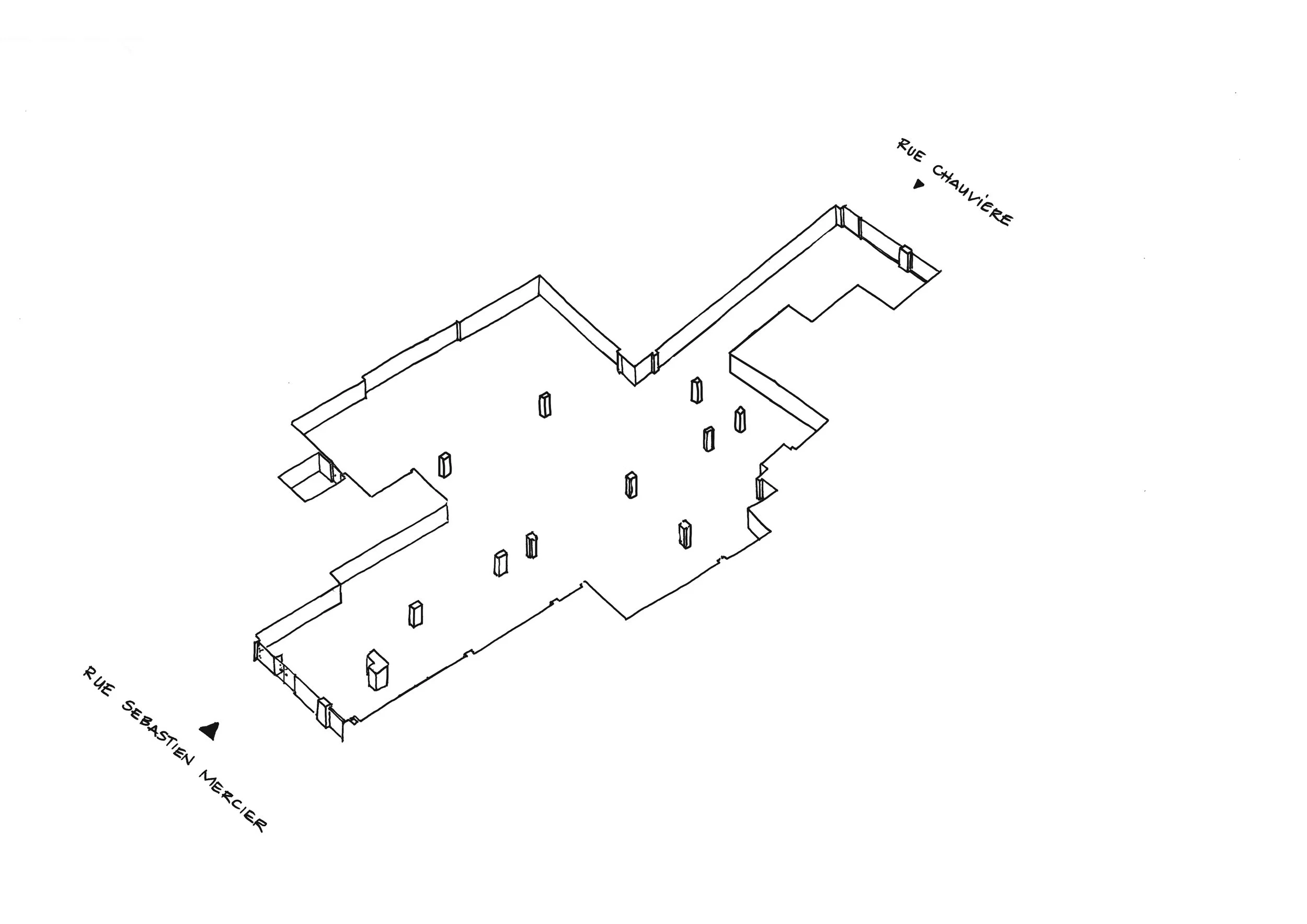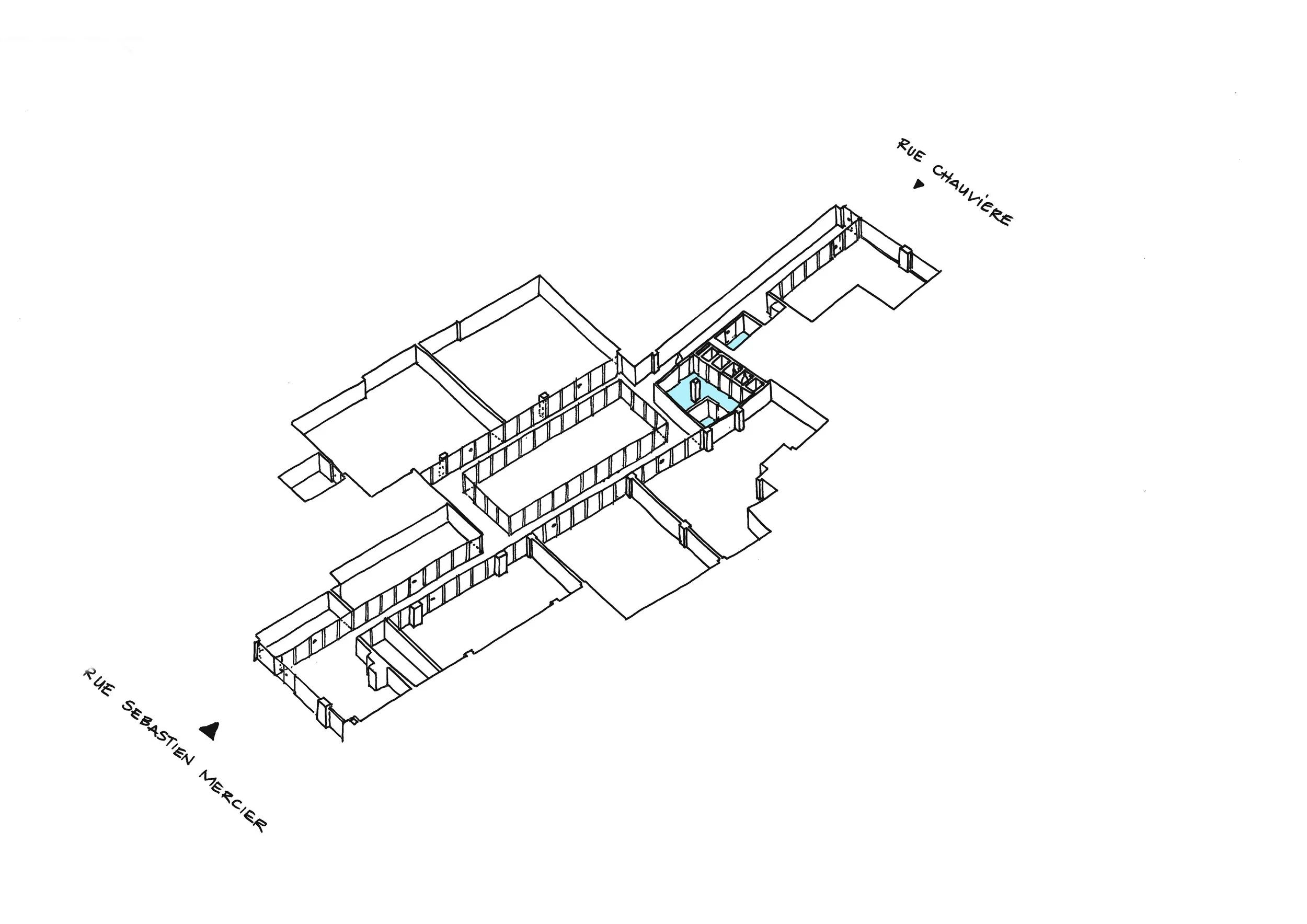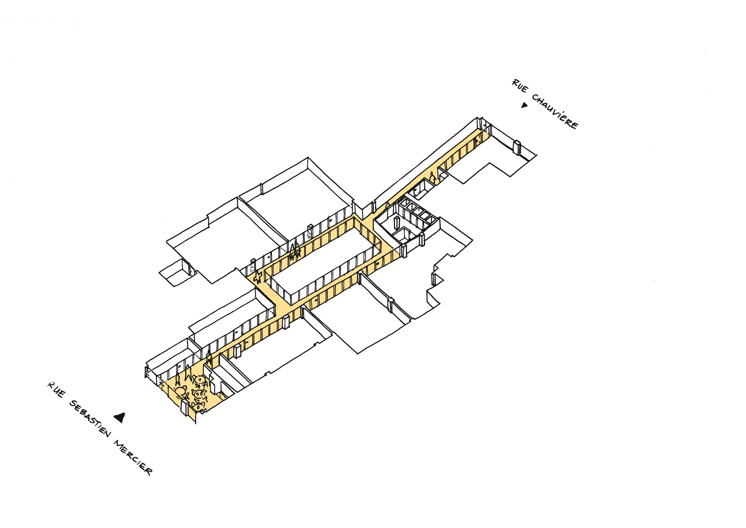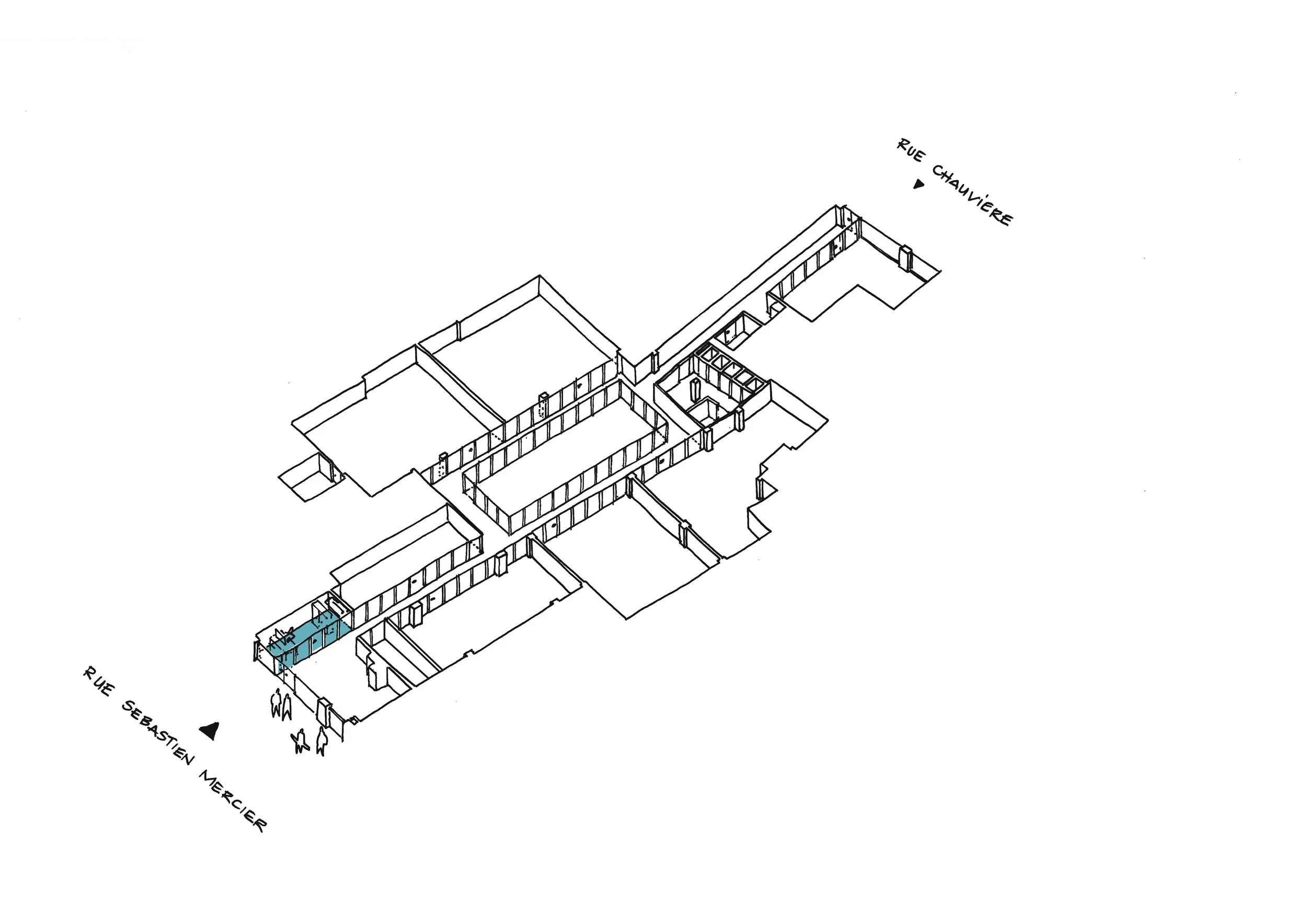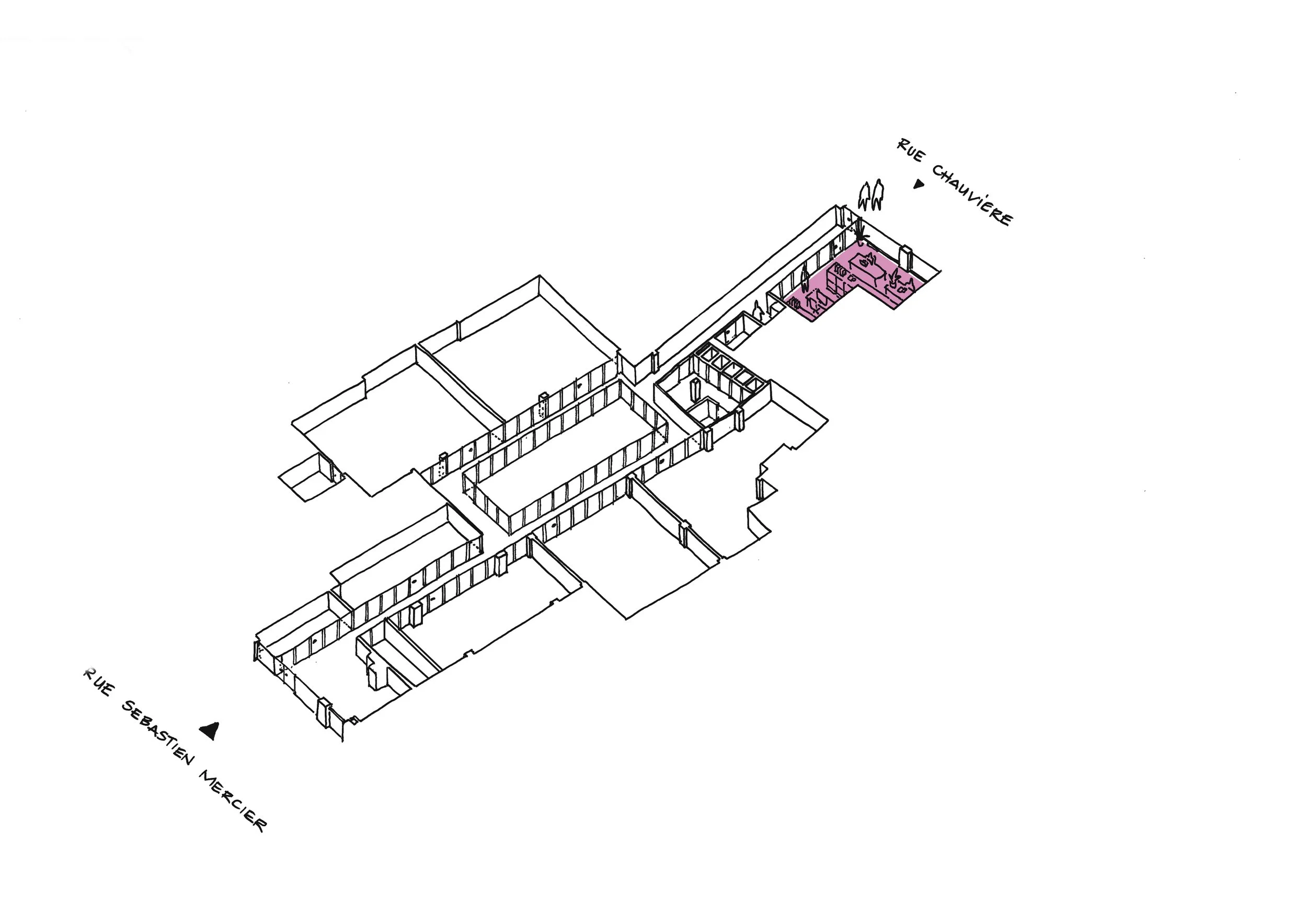 Mesnil Architectures est missionnée pour transformer un local traversant de 500 m² en rez-de-chaussée, situé entre la rue Sébastien-Mercier et la rue Emmanuel-Chauvière, en un lieu contemporain capable d’accueillir les ateliers, les salles de cours, l’administration et les espaces de vie de l’école.