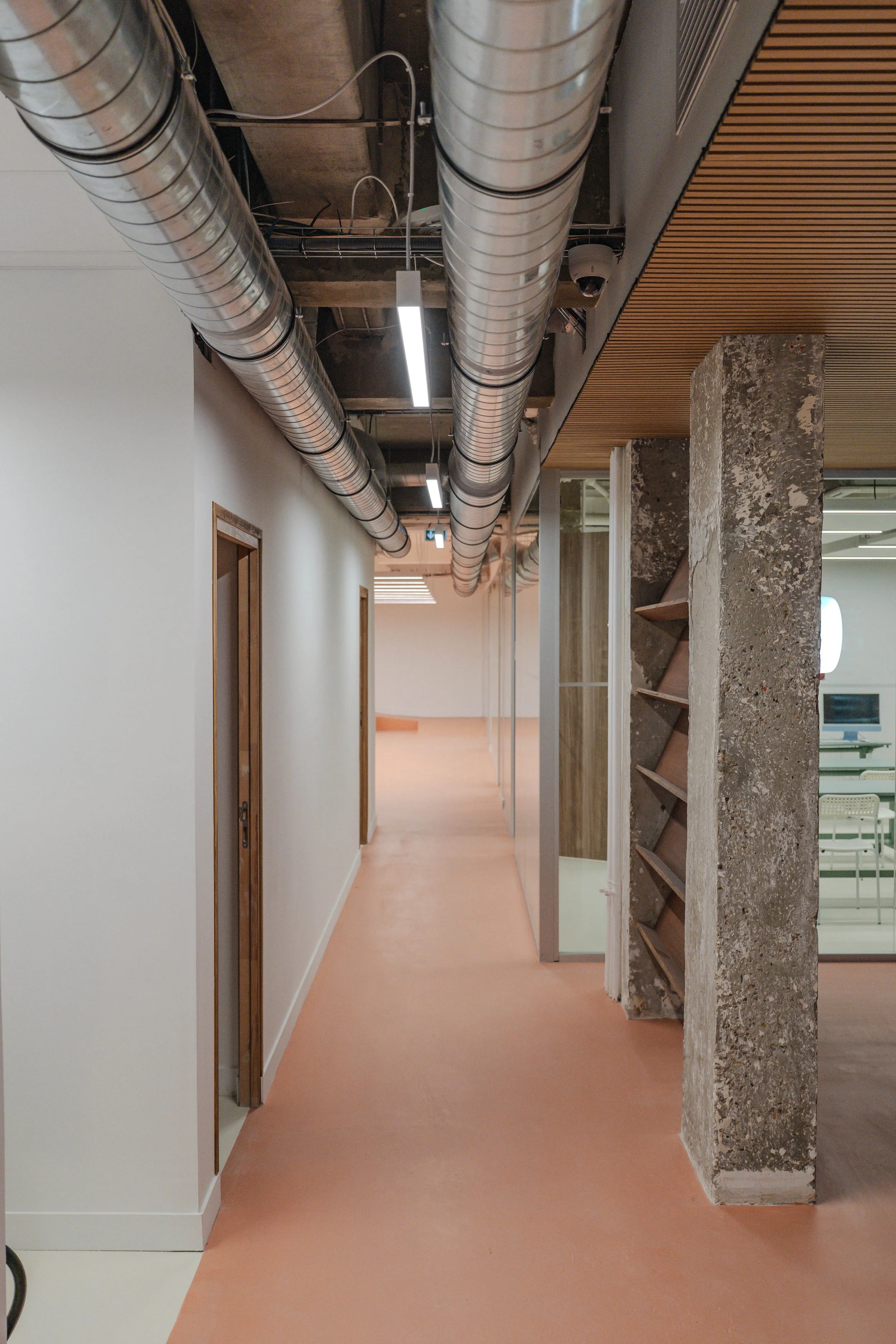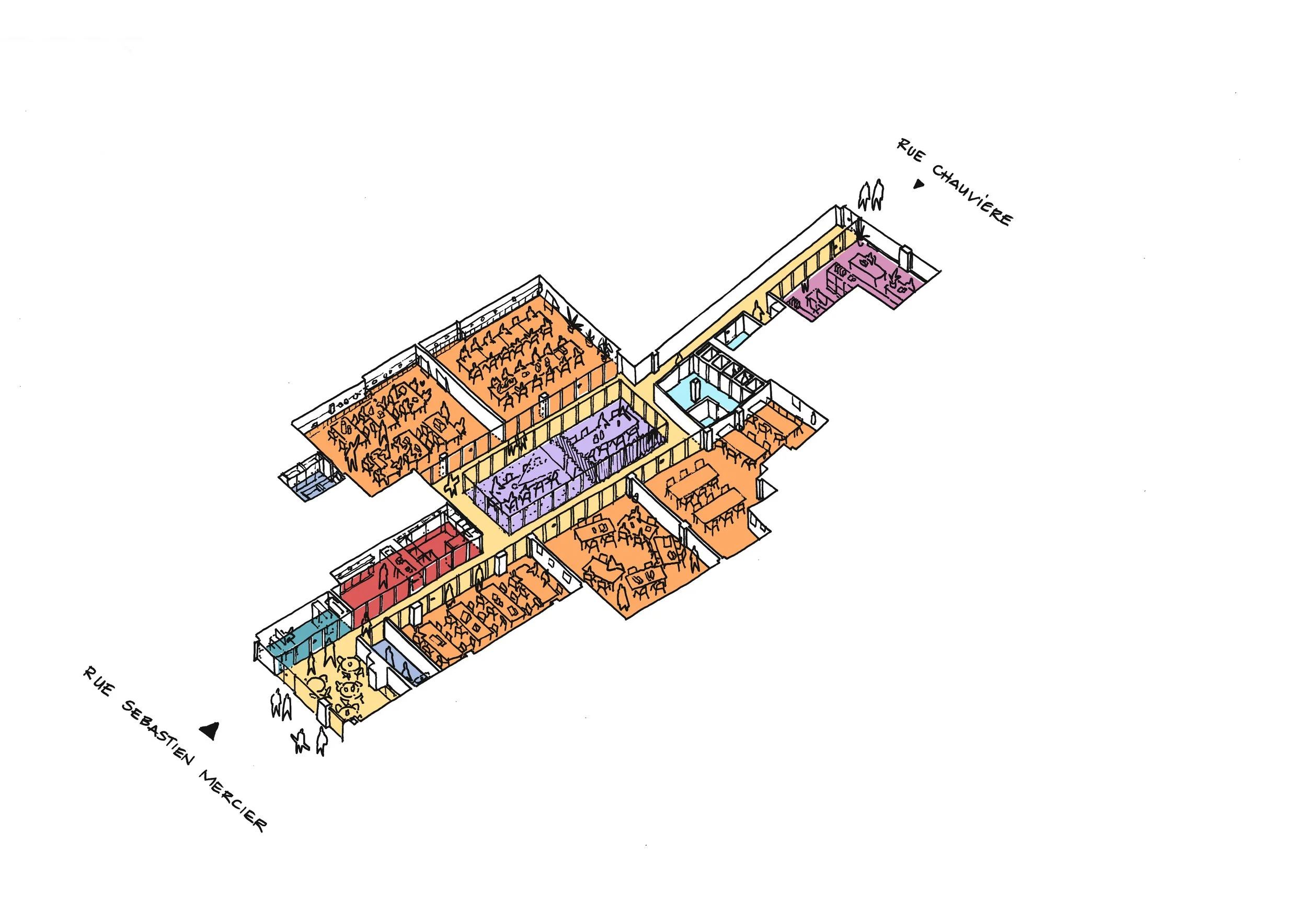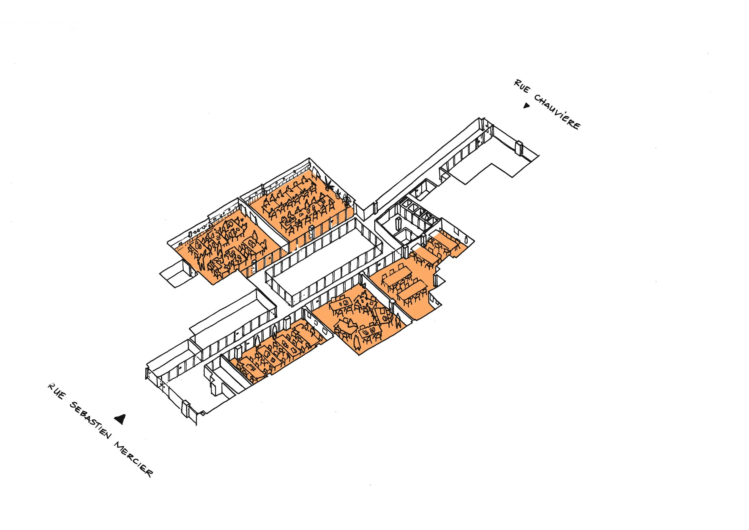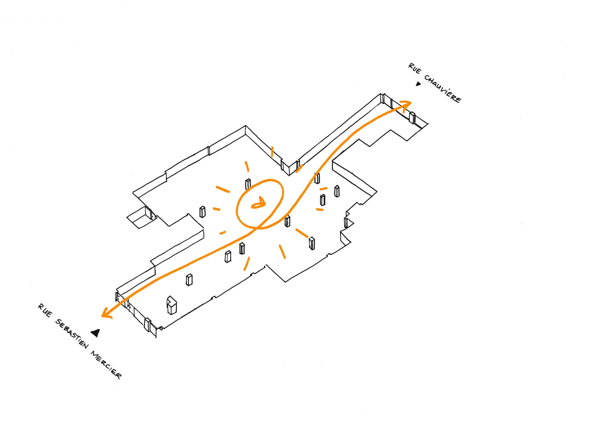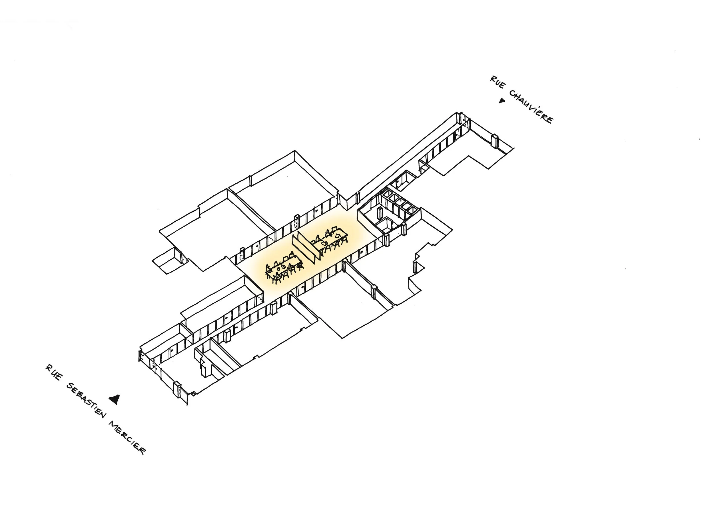 Selon nous, c’est créer une centralité qui organise tout le lieu. Un axe clair, qui relie les deux rues et devient la colonne vertébrale du campus. Autour de ce parcours se branchent les ateliers, la matériauthèque, les salles de cours, les zones de travail calme, la cafétéria. Un cœur se forme. Les usages se rencontrent. Les circulations ne sont plus de simples couloirs, mais des espaces où l’on croise, où l’on voit, où l’on discute — ce qui fait la vie d’une école.