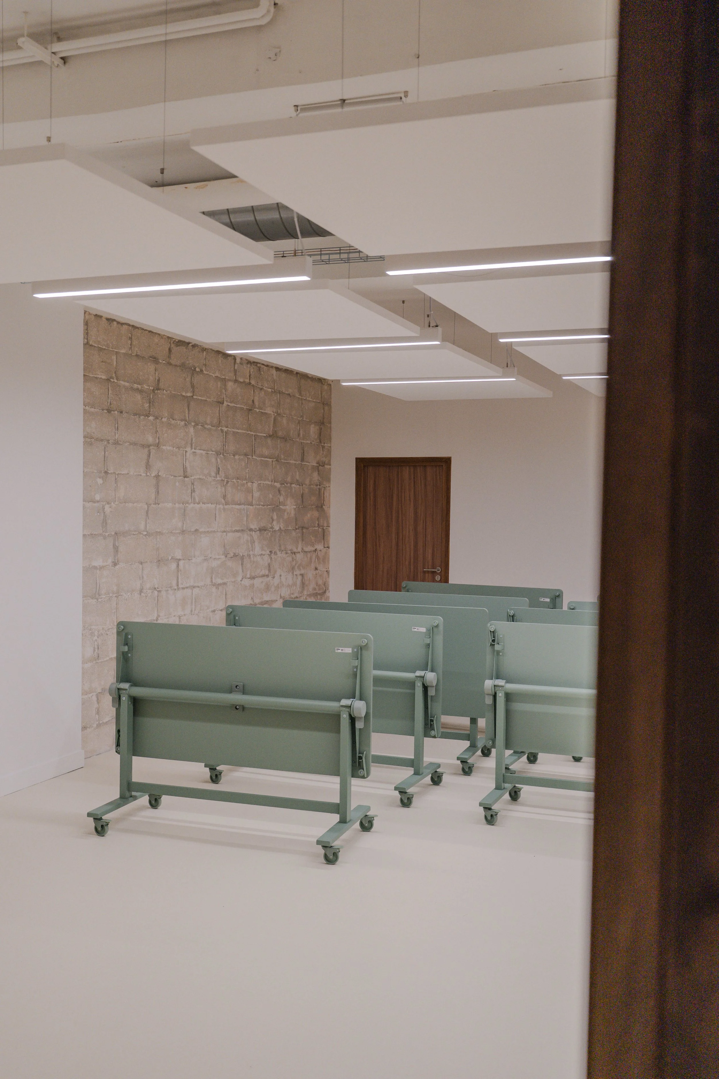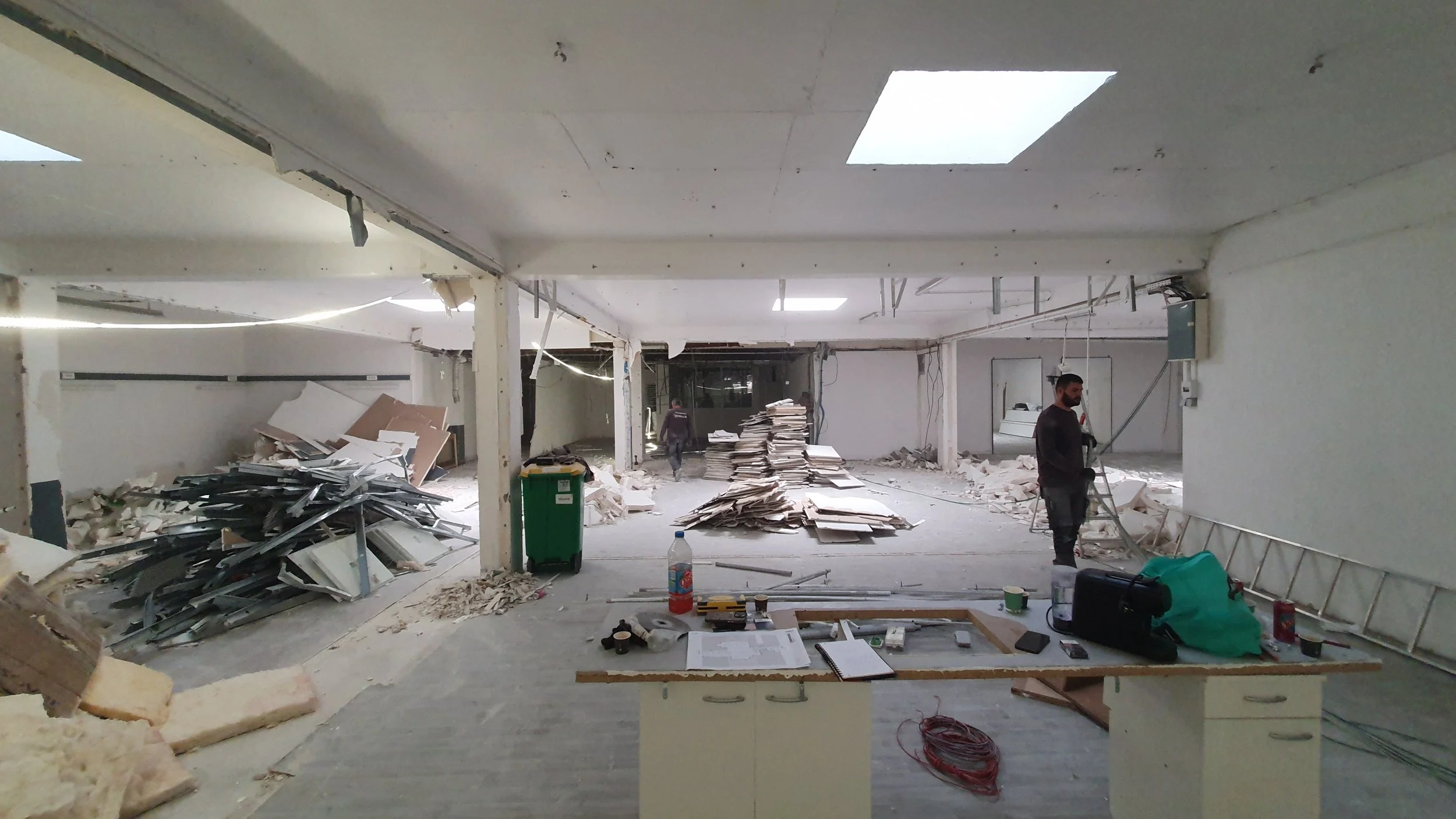 Le projet commence par un curage complet. Une fois l’existant retiré, le local apparaît pour ce qu’il est : un grand plan libre ponctué de poteaux, traversant, avec un vrai potentiel d’appropriation. À partir de là, une question simple guide le projet : comment fait-on école ?