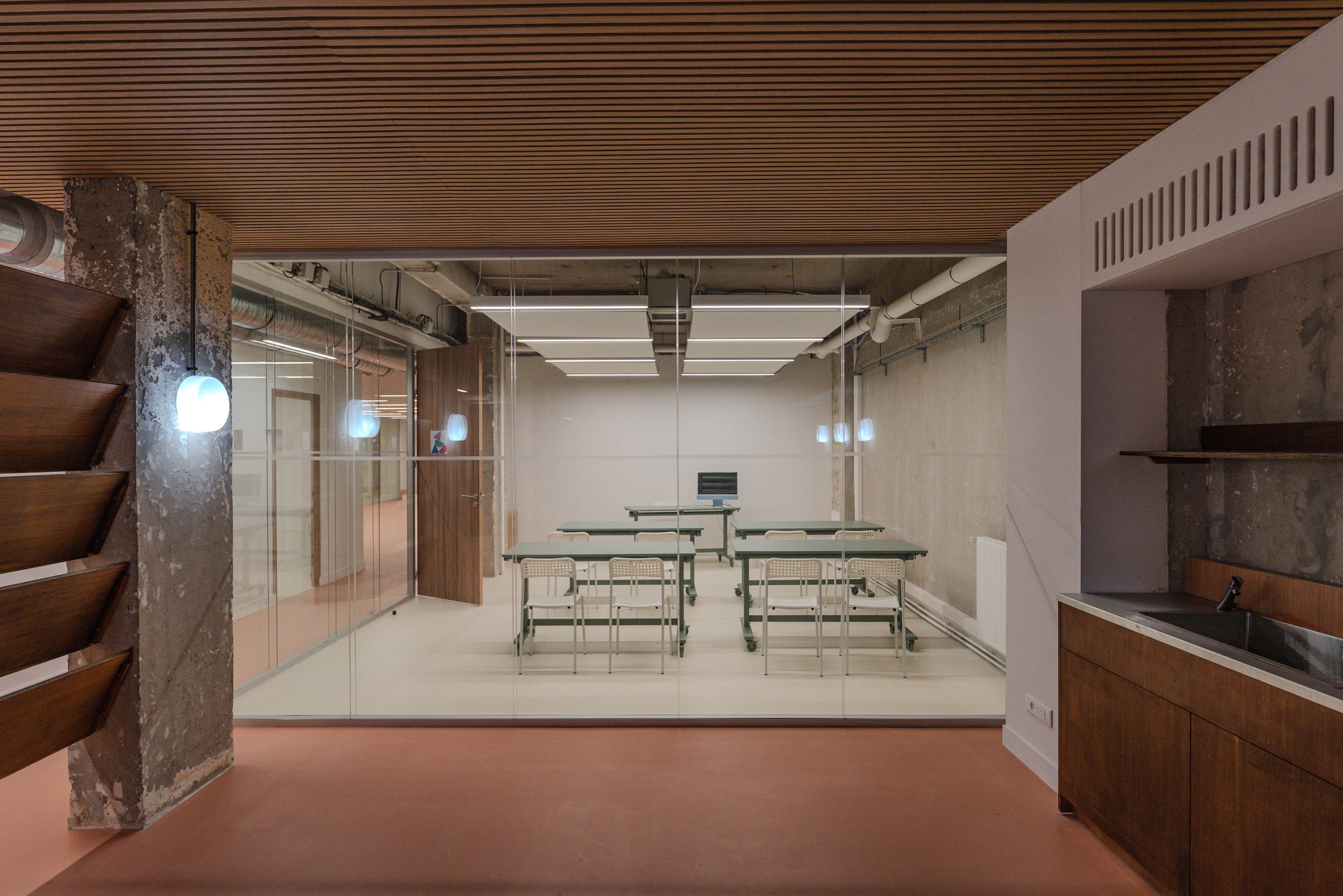 Les salles sont conçues comme des plateaux simples, lumineux, permettant le travail en groupe autant que la concentration individuelle. Les pièces d’eau sont regroupées pour libérer l’espace. Les ateliers sont visibles dès l’entrée, pour donner à voir ce qui s’y fabrique. L’administration est positionnée de manière à gérer les accès et accueillir les étudiants sans rompre la fluidité générale.