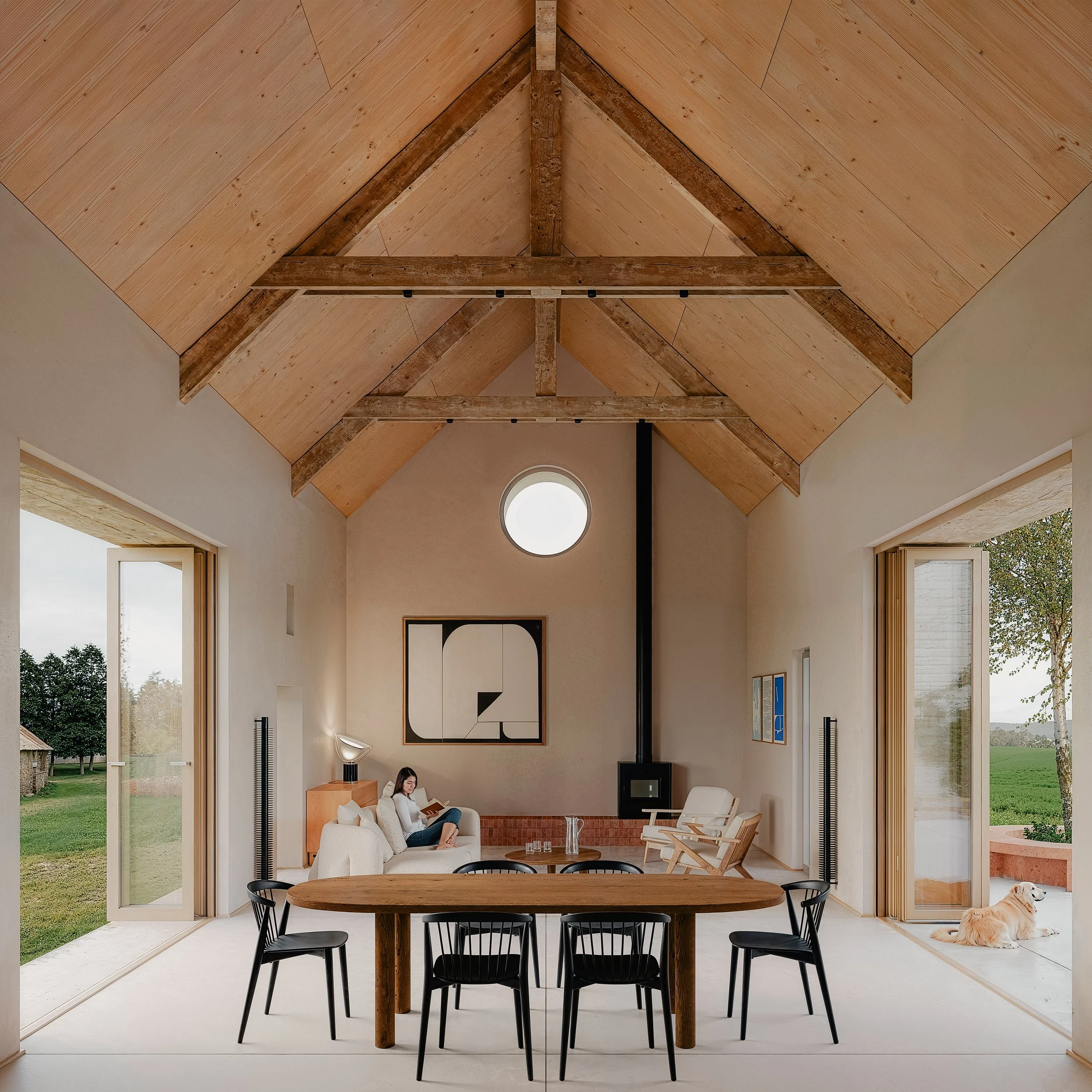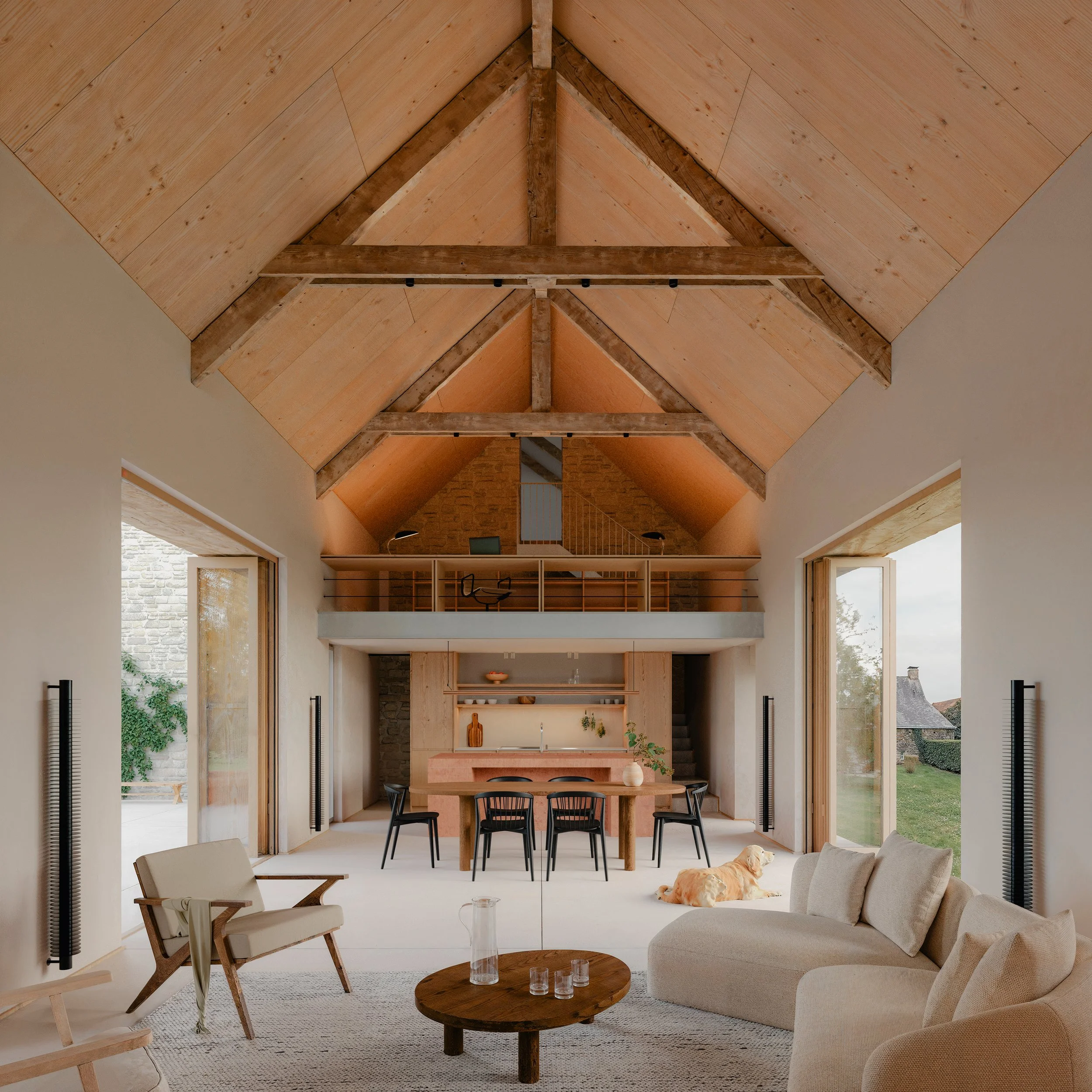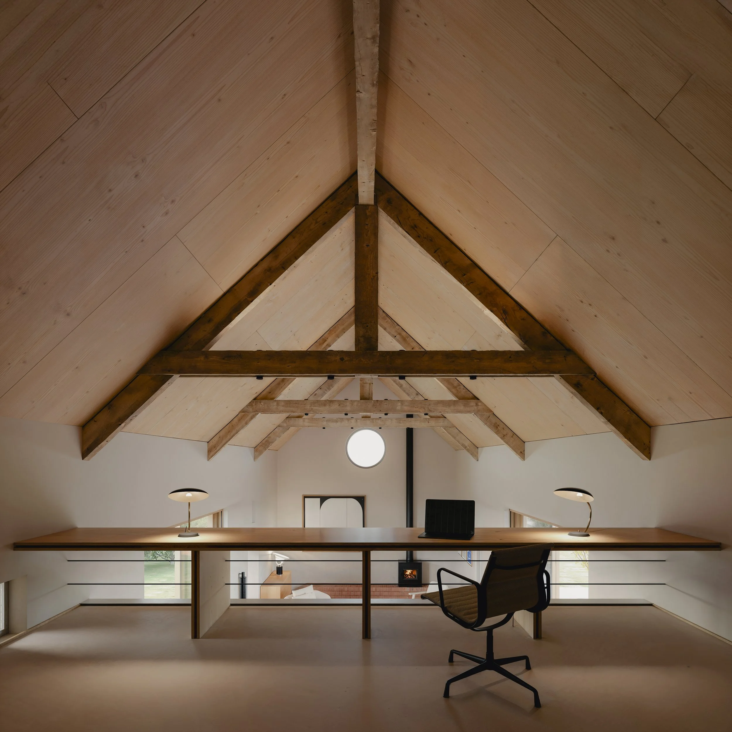 L’ancienne étable devient le cœur du projet : une double hauteur mise en lumière par deux grandes baies, et la mezzanine existante transformée en bureau ouvert sur le volume. La charpente est conservée, le volume clarifié, les matériaux assainis. La longère réunit quant à elle les espaces domestiques : une entrée généreuse, une suite parentale tournée vers les champs, deux studios côté jardin, puis, sous les combles, une salle de jeux traversante et quatre chambres rassemblées autour des pièces d’eau. Un escalier relie naturellement ce niveau à la mezzanine-bureau.